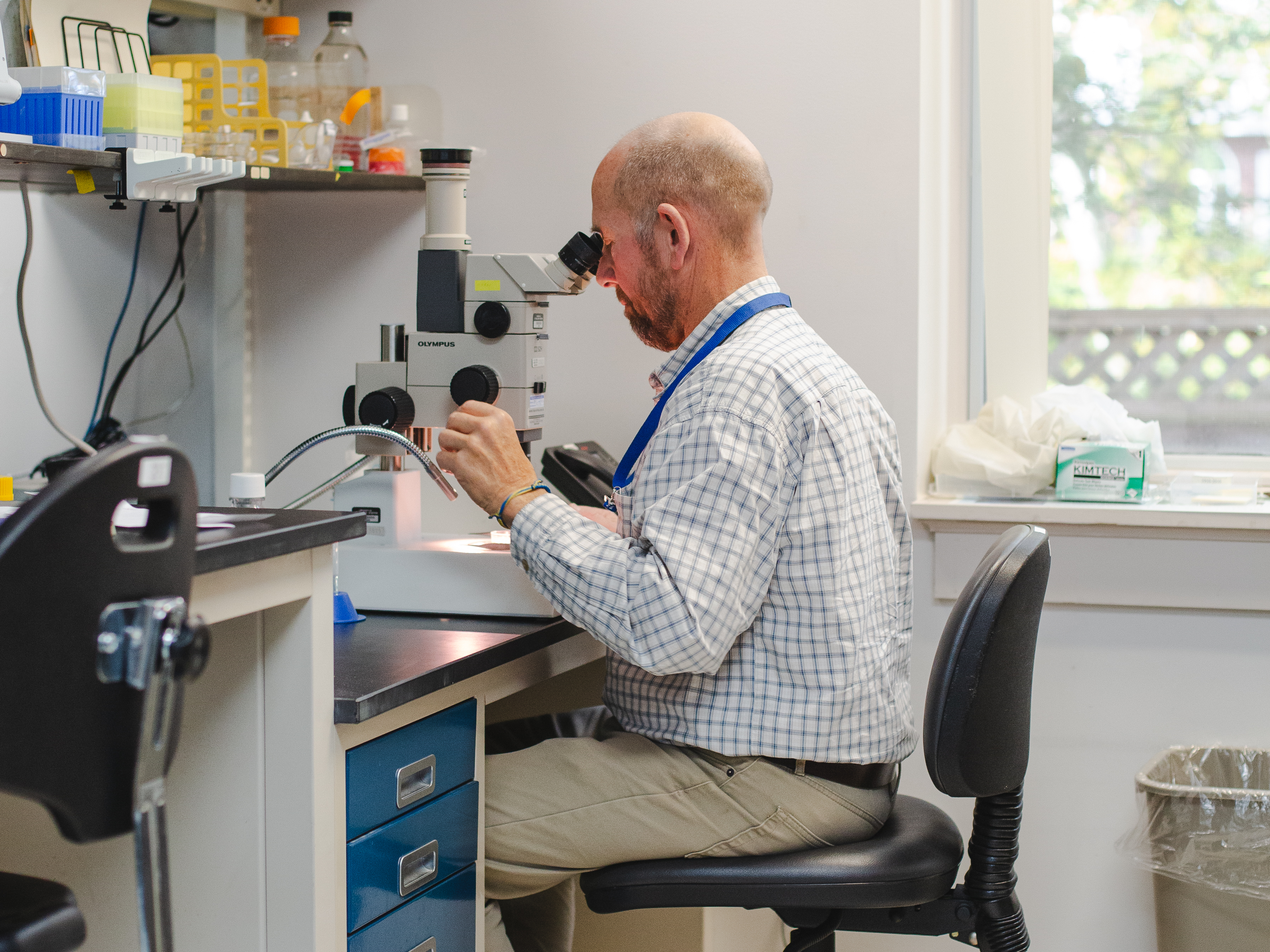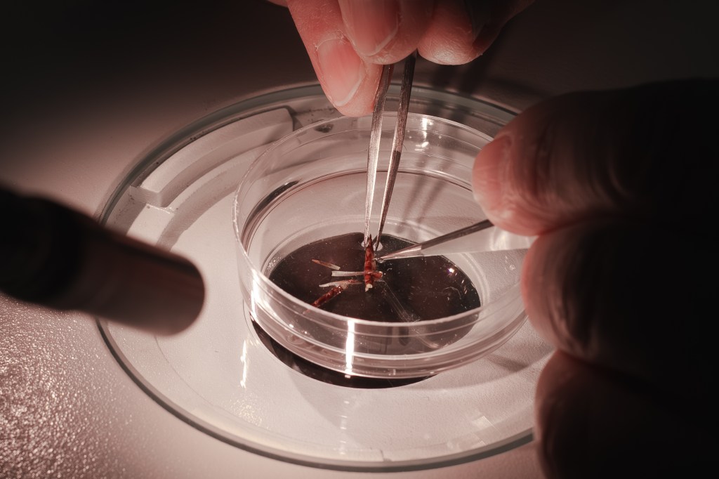 Plant pathologist Robert Marra pries open a beech bud, looking for the invasive worm Litylenchus crenatae mccannii. | The Boston Globe Magazine